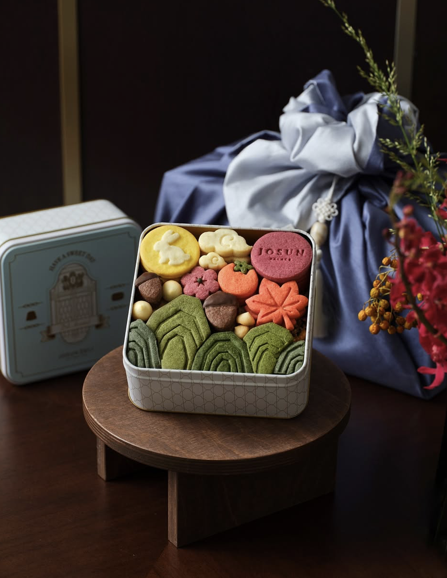 일월오봉도를 모티브로 한 구움과자 세트. 조선델리 더 부티크의 파티시에가 프리미엄 재료로 정성담아 구워냈다. 조선팰리스 로고가 새겨진 해와 토끼가 뛰노는 달, 가을을 상징하는 과일과 꽃, 다섯개의 봉우리가 풍요로움을 선사한다.