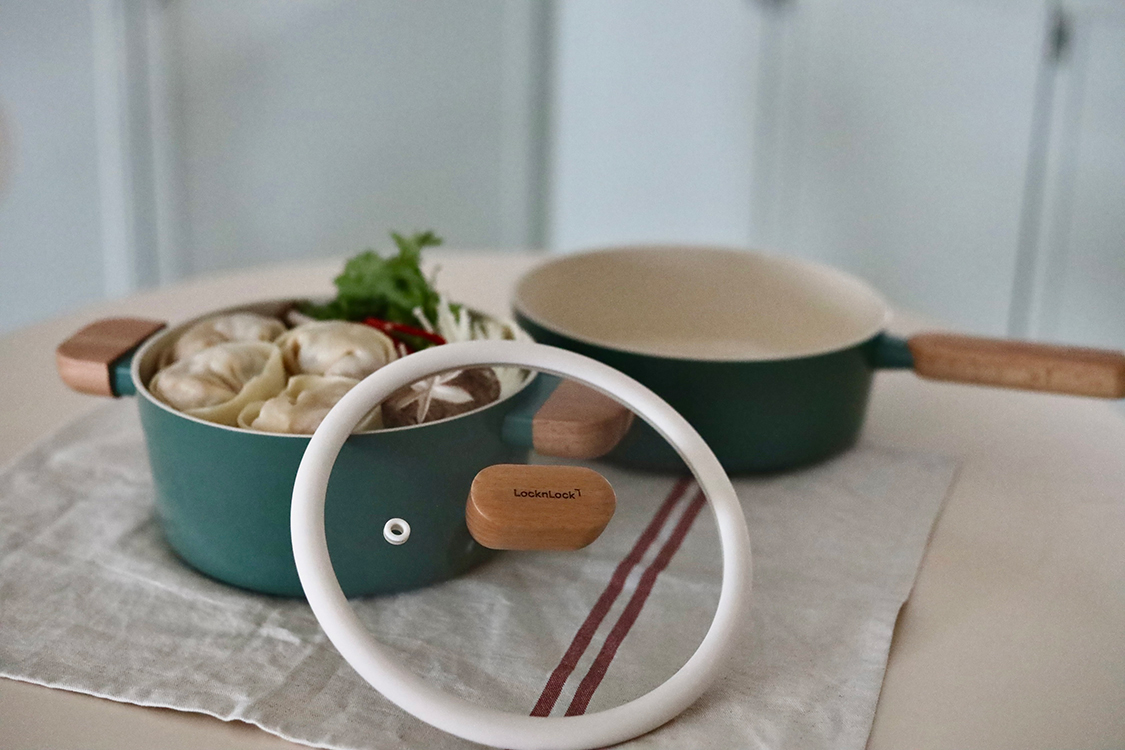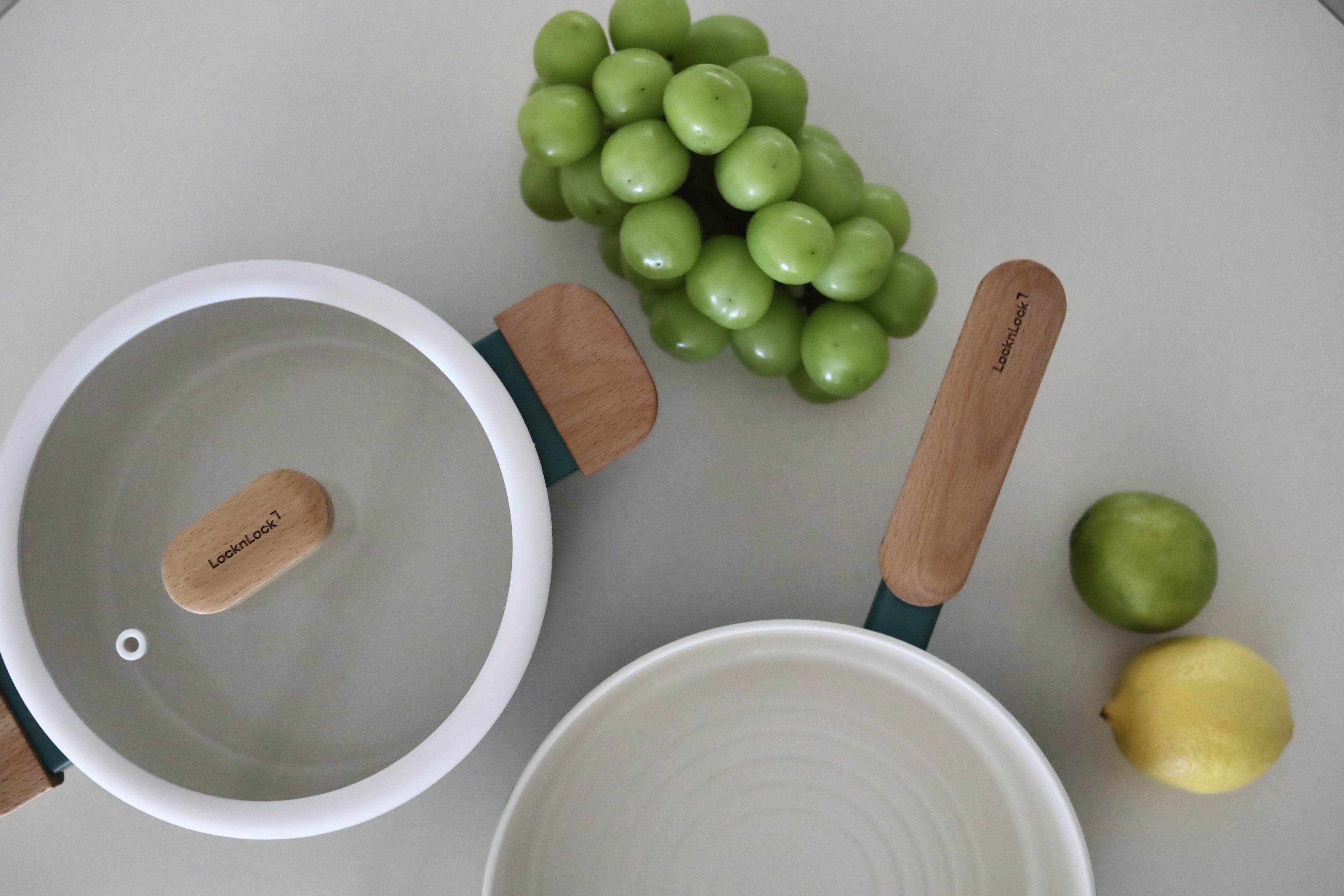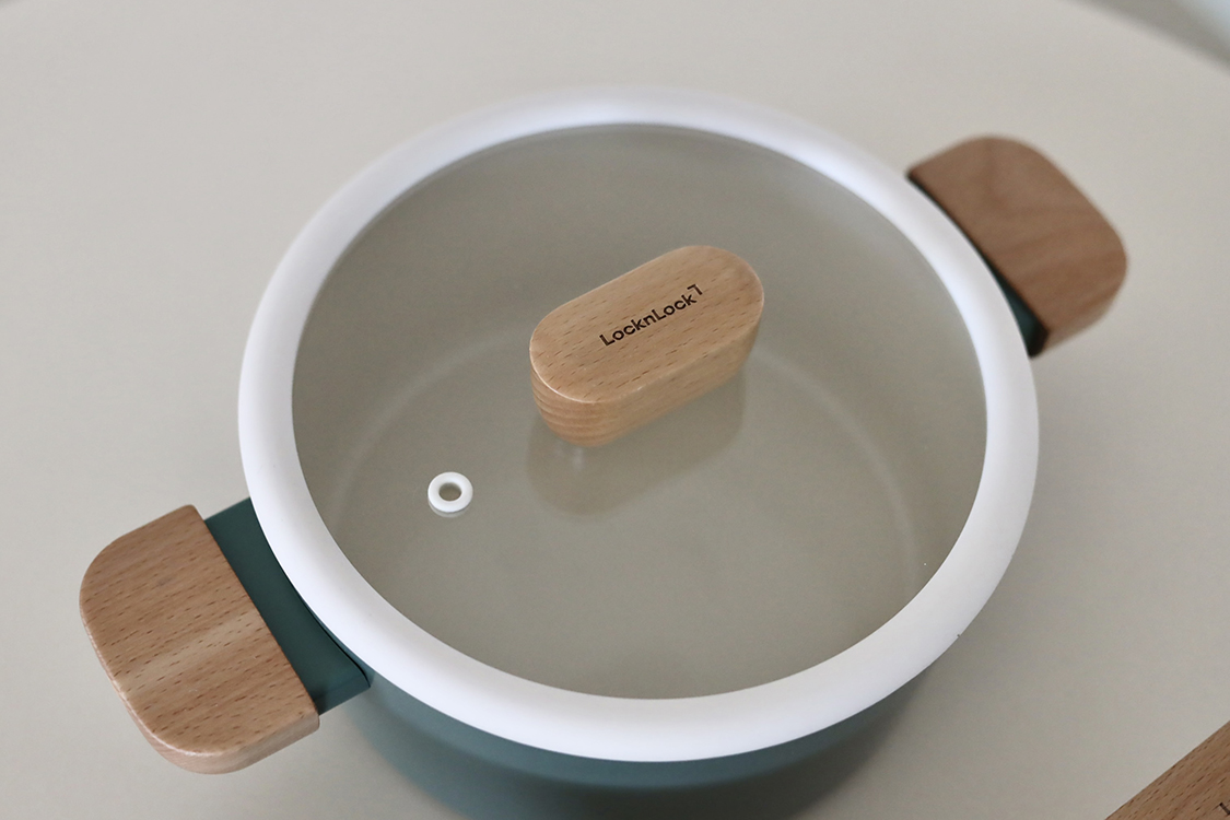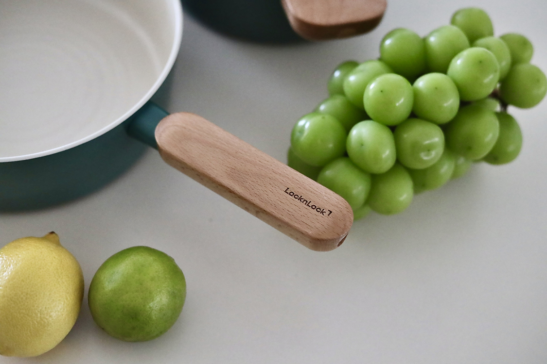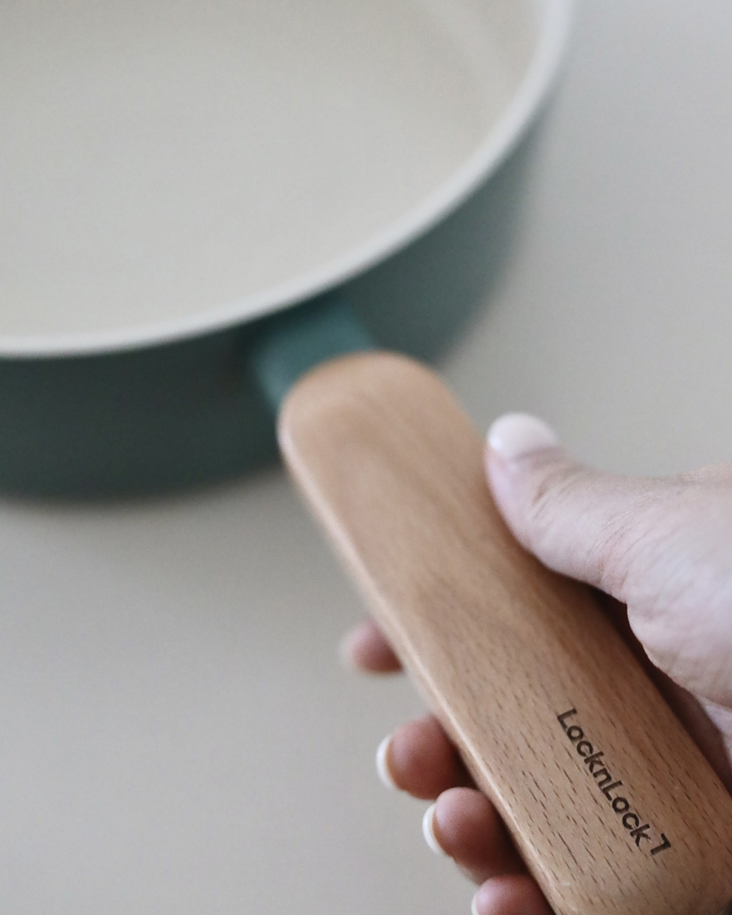 그린 계열의 세이지 컬러와 우드 핸들 조합은 주방은 물론 테이블 위에서도 존재감을 발휘하는데요. 조리 후 굳이 옮겨 담지 않고 그대로 식탁에 올려도 플레이팅이 완성됩니다.