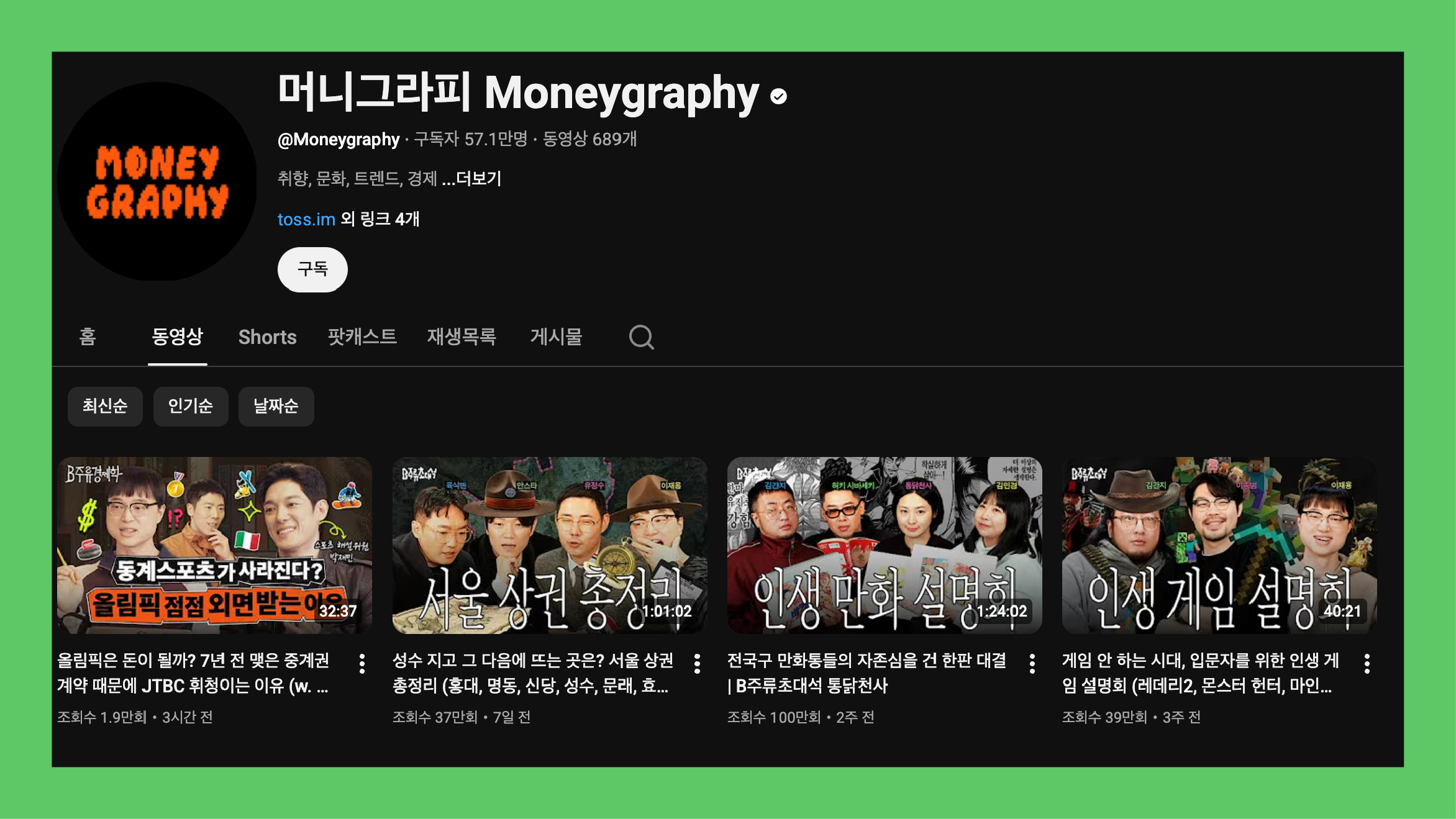 금융 서비스 토스가 기획, 제작, 운영하는 유튜브 채널이다. 패션, 술, 음악, 영화 등 취향 시장 뒷면의 경제 이야기를 자연스럽게 나누도록 하는 콘텐츠로 사랑받는다. 특히 인기가 많은 콘텐츠는 'B주류경제학' 시리즈. 돈 이야기도 재미있게 할 수 있다는 사실을 발견해보자.