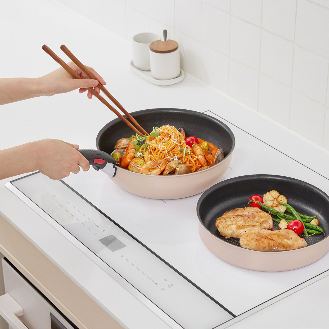 테팔 매직핸즈 크렘의 탈부착이 가능한 손잡이는 좁은 레인지나 인덕션, 식탁 위, 주방 수납장까지 언제 어디서든 빛을 발합니다. 여러 개의 팬을 놓고 동시에 요리를 할 때면 손잡이끼리 부딪히고 팬이 밀리는 일이 다반사인데요. 테팔 매직핸즈는 뜨겁게 데워진 팬을 들어 올릴 때엔 안전하게 부착해 사용하고, 조리 중이거나 옮길 때는 손잡이를 떼어 놓을 수 있어 공간 효율을 훨씬 높일 수 있어요. 또 팬 위에서 완성된 요리를 따로 그릇에 옮겨 담거나 덜 필요 없이 식탁 위에 그대로 옮겨 놓으면 되니 이보다 더 간편할 수는 없죠.