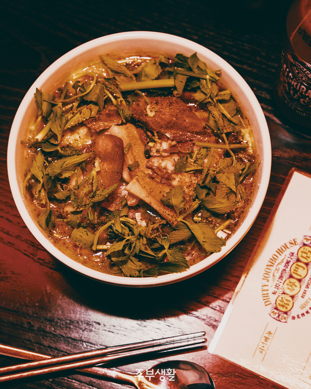 잡내 없이 깨끗한 풍미에 미나리와 산초 기름 등으로 맛을 끌어올린 저저의 돼지국밥