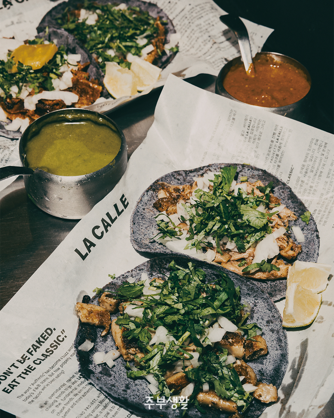 멕시코 음식을 하나의 스타일로만 정의할 수는 없기에 다양한 공간을 보여주고 싶었어요. 스트라트 타코라는 음식과 어울리는 공간을 찾다 보니 시장에 라까예를 열게 되었고요. 멕시코에서 타코는 남녀노소 누구나 어디서든 간편히 즐기는 음식이거든요.
