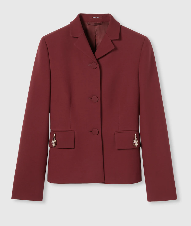 컬러는 대담하지만 미니멀한 실루엣으로 우아함을 잃지 않은 울 소재의 싱글 브레스트 자켓. 포켓 전면에는 호랑이 모티브의 골드 장식이 강렬함을 더했다. 480만원.