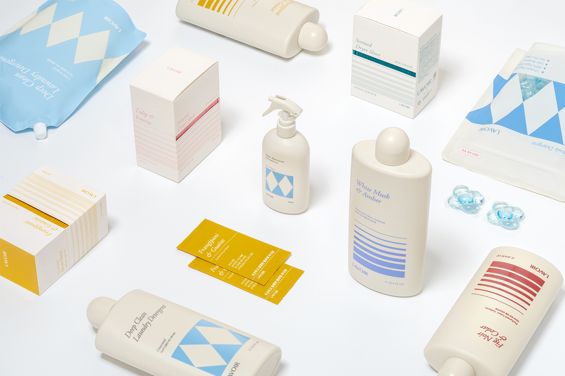 퍼퓸드 비건 라이프스타일 브랜드 라브아는 건강하고 자극 없는 고품질의 비건 포뮬러에, 프랑스 조향사의 섬세한 블렌딩으로 만든 니치퍼퓸의 향을 담은 생활용품을 선보이고 있습니다. 청소하고 세탁기를 돌리고 집안을 정돈하는 일상의 순간을 더 감각적으로 만들어주죠. 패키지에 새겨진 컬러 패턴의 그래픽 모티브는 놓인 공간의 분위기를 한층 더 유니크하게 바꿔주기도 해요.