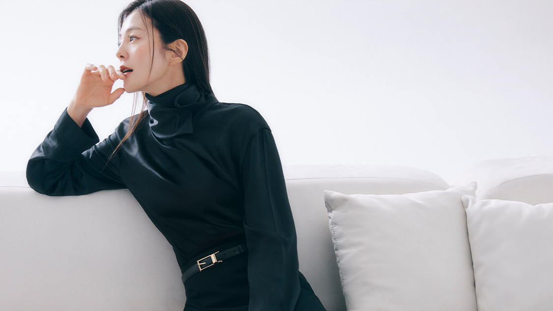 새틴 블라우스, 랩스커트가 레이어드된 팬츠, 블랙 벨트, 스퀘어 토 펌프스 모두 RECTO40대 워킹맘으로 지낼 수 있는 원동력을 한마디로 정의해본다면요?