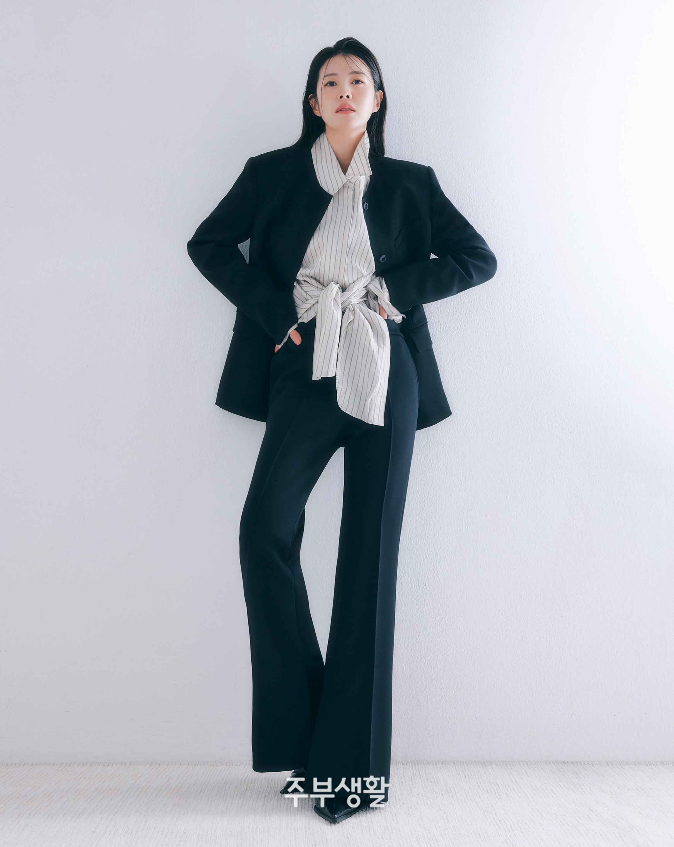 블랙과 화이트 배색 블레이저, 러플 칼라 블라우스, 벌룬 셰이프 팬츠 모두 TOENN 유튜브 채널 ‘햅삐김성은’이 벌써 2주년을 맞이했네요. 삶에서 꽤 큰 부분을 차지하는 공간일 것 같아요.