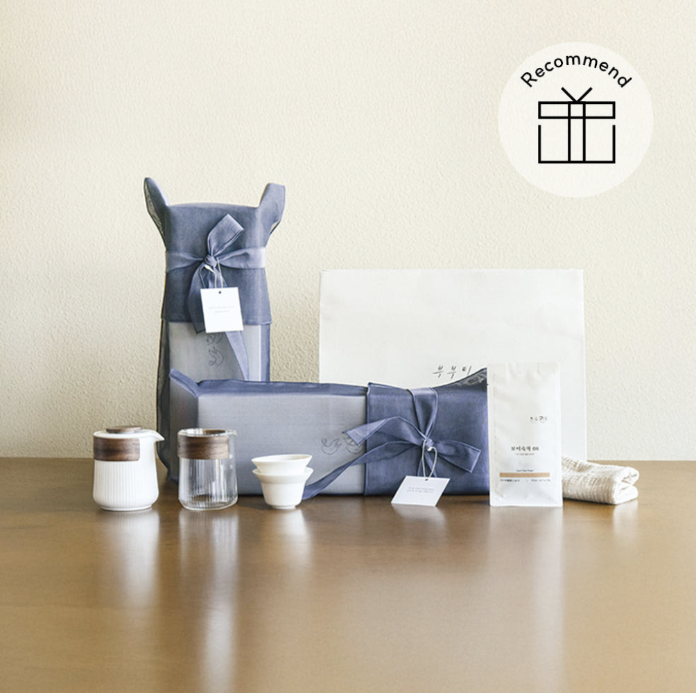 선물 받는 사람이 차 마시는 순간의 행복을 느끼기를 원한다면 부부티의 2인 차도구세트를 선물해보자. 현대적인 디자인이 가미된 유리 공도배와 도자기 거름망 티포트, 도자기 찻잔 2개, 보이숙차와 차수건으로 구성한 세트다. 분해하지 않아 천천히 우러나는 잎차인 보이숙차 덕분에 더 깊고 긴 대화를 이끈다.