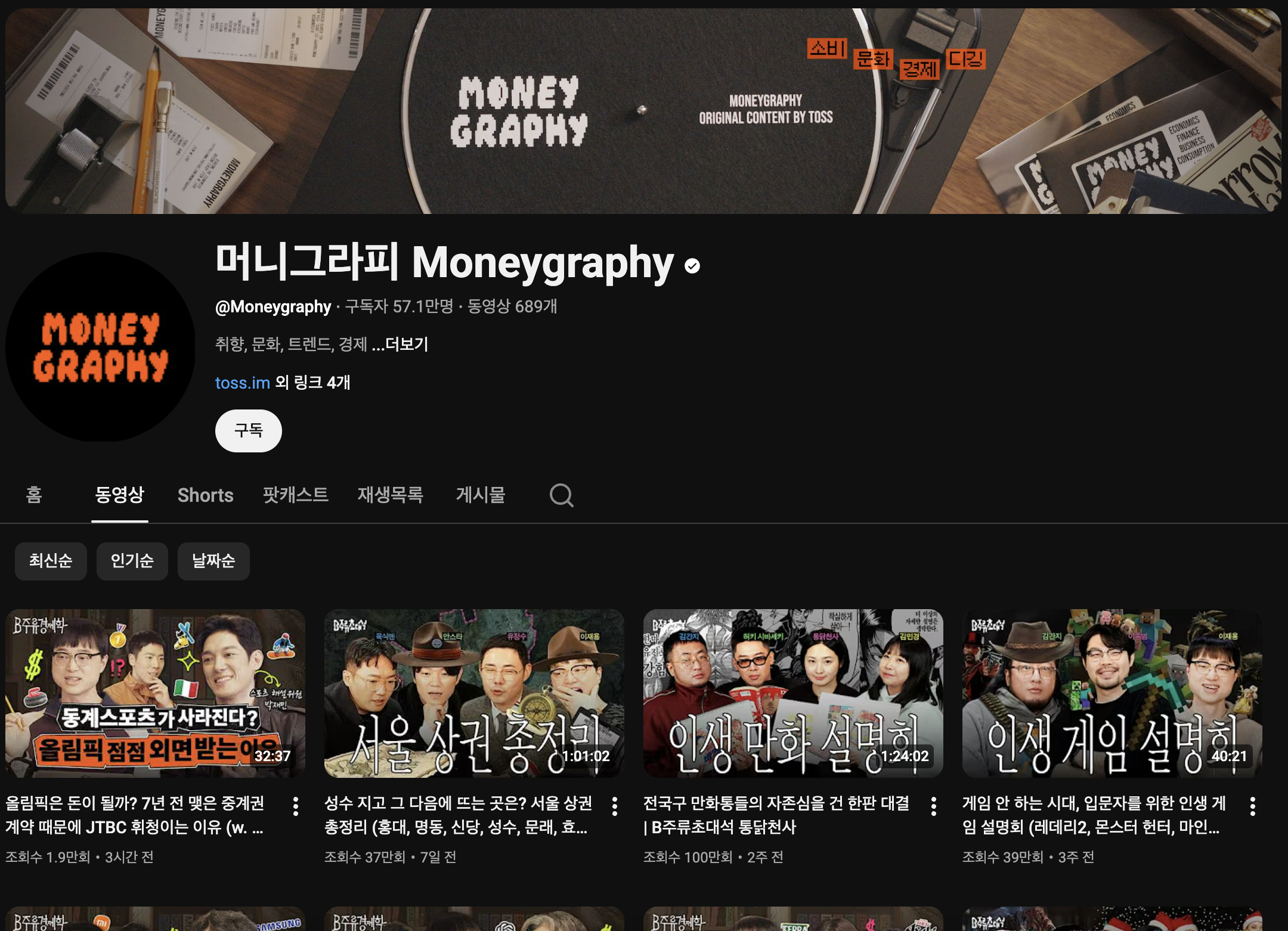 금융 서비스 토스가 기획, 제작, 운영하는 유튜브 채널이다. 패션, 술, 음악, 영화 등 취향 시장 뒷면의 경제 이야기를 자연스럽게 나누도록 하는 콘텐츠로 사랑받는다. 특히 인기가 많은 콘텐츠는 'B주류경제학' 시리즈. 돈 이야기도 재미있게 할 수 있다는 사실을 발견해보자.
