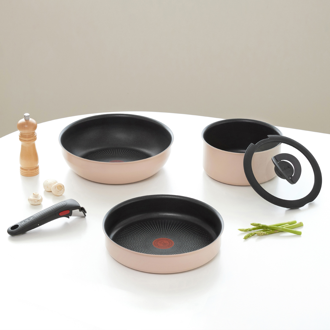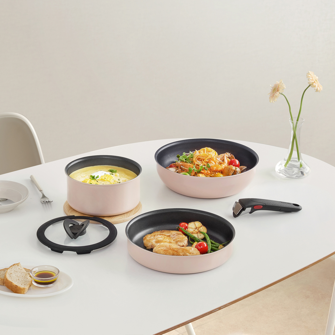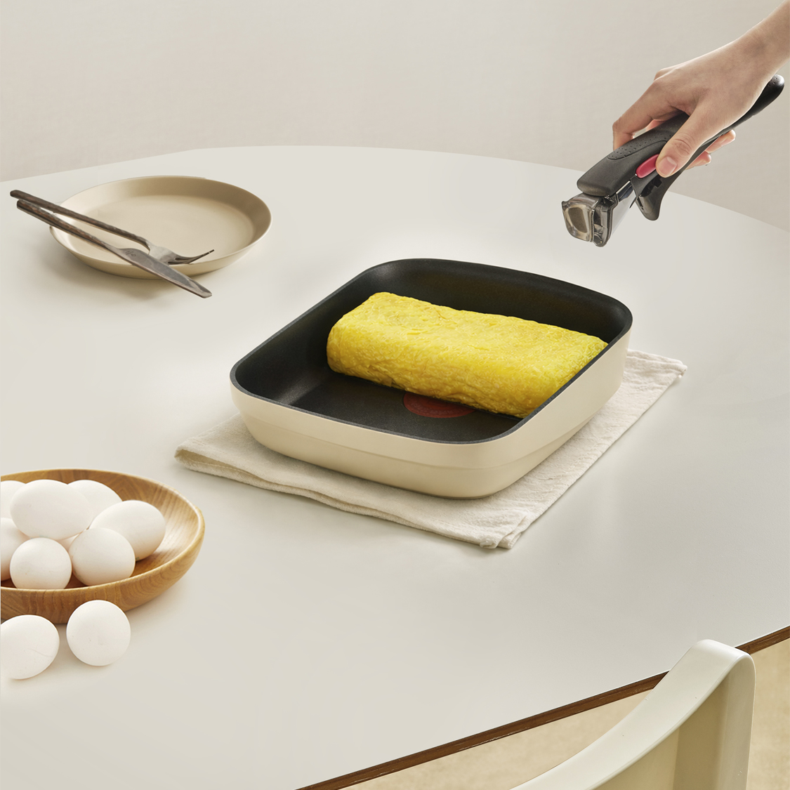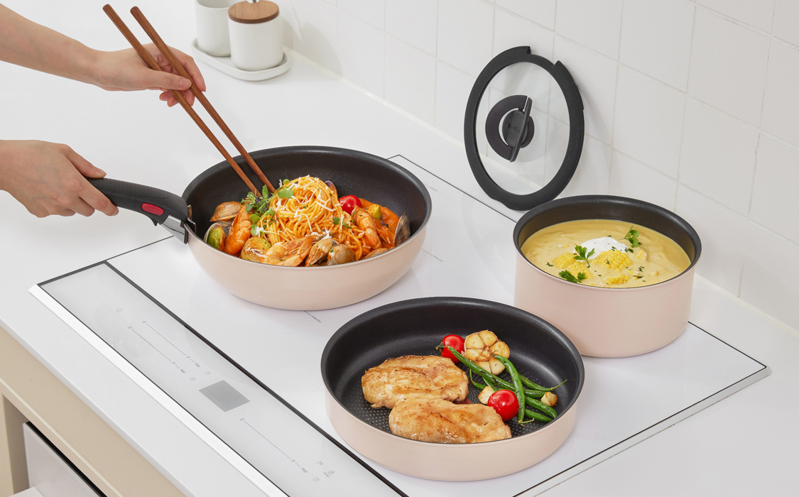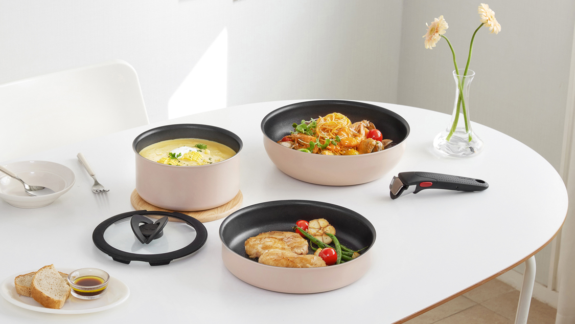 손잡이를 제거하고 팬을 그릇처럼 쓰는 데는 다 그만한 이유가 있습니다. 바로 코지한 감성의 화사하고 따뜻한 색감 때문이에요. 부드러운 피치 컬러의 팬 매직핸즈 크렘과 따뜻한 버터 컬러의 계란말이팬은 어떤 요리, 어떤 식탁에도 잘 어울리죠. 플레이팅에도 손색 없는 조리 팬이라니, 너무 매력적이지 않나요? 게다가 팬에 남은 잔열 덕분에 음식을 오랫동안 따뜻하게 먹을 수 있는 점도 무척이나 매력적이에요!