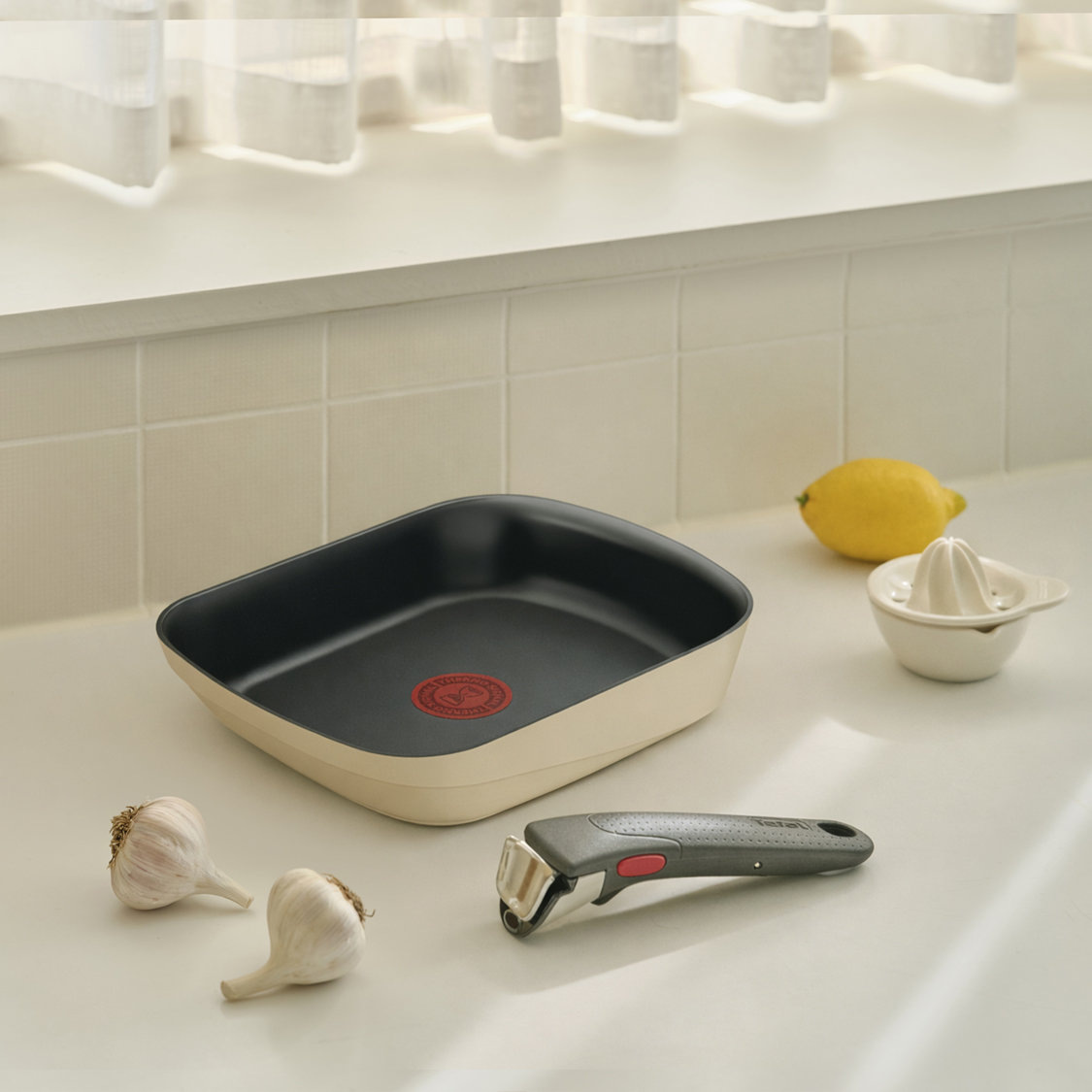 테팔 매직핸즈 크렘의 탈부착이 가능한 손잡이는 좁은 레인지나 인덕션, 식탁 위, 주방 수납장까지 언제 어디서든 빛을 발합니다. 여러 개의 팬을 놓고 동시에 요리를 할 때면 손잡이끼리 부딪히고 팬이 밀리는 일이 다반사인데요. 테팔 매직핸즈는 뜨겁게 데워진 팬을 들어 올릴 때엔 안전하게 부착해 사용하고, 조리 중이거나 옮길 때는 손잡이를 떼어 놓을 수 있어 공간 효율을 훨씬 높일 수 있어요. 또 팬 위에서 완성된 요리를 따로 그릇에 옮겨 담거나 덜 필요 없이 식탁 위에 그대로 옮겨 놓으면 되니 이보다 더 간편할 수는 없죠.